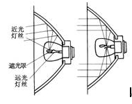 前照燈燈泡內有兩條燈絲,一條為遠光燈絲,一條為近光燈絲。遠光燈絲位于反光碗的焦點上,其反射光線是平行水平光線,可將車輛前方較遠的路面照亮;近光燈絲則位于反光碗焦點的上方,其反射光線為向下的平行光線,可以照亮車輛前方較近的路面,對來車駕駛員和其他行人不會造成炫目和不舒適的感覺。前照燈的燈光高低可以通過燈光調整螺釘來進行調節,旋出螺釘,燈光中心向上移動;旋緊螺釘,燈光中心向下移動。