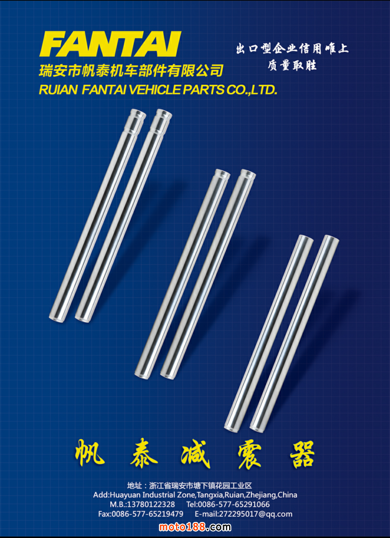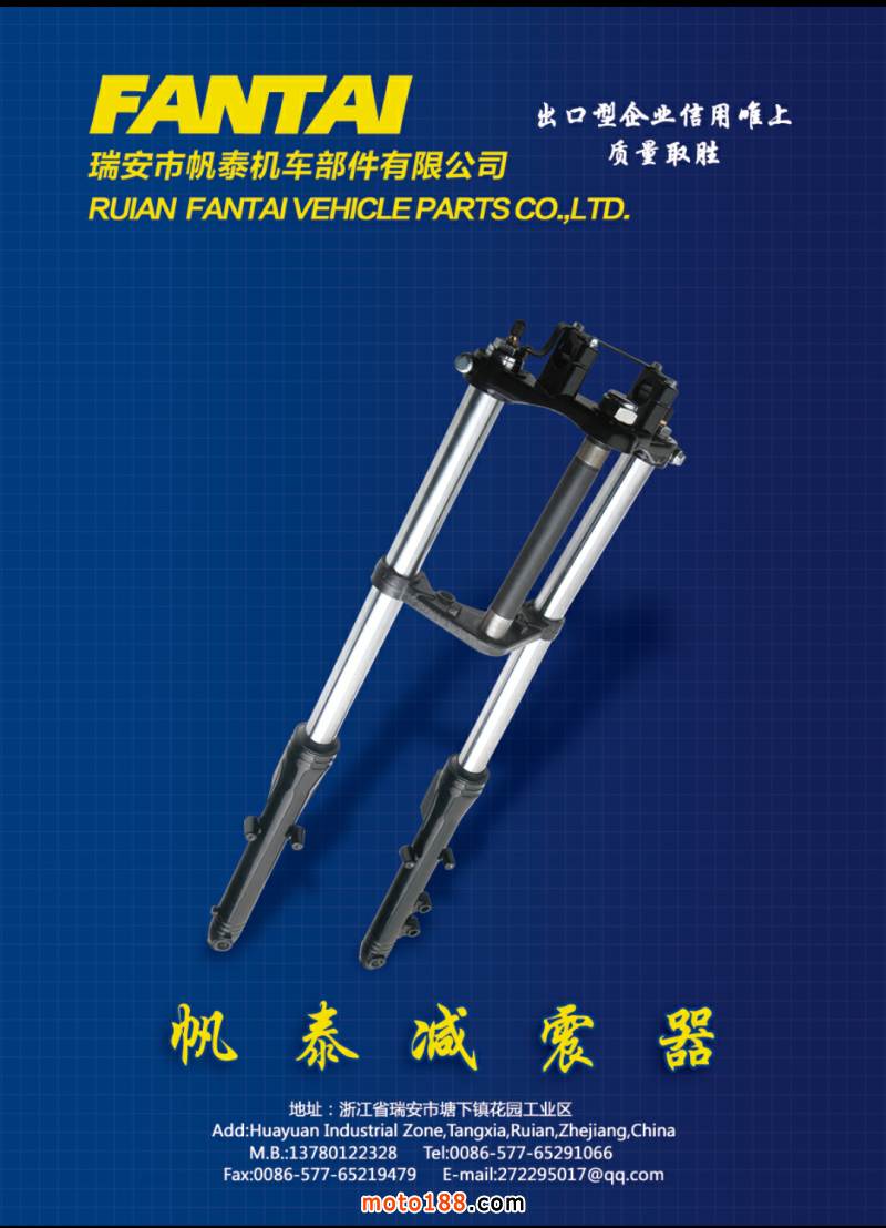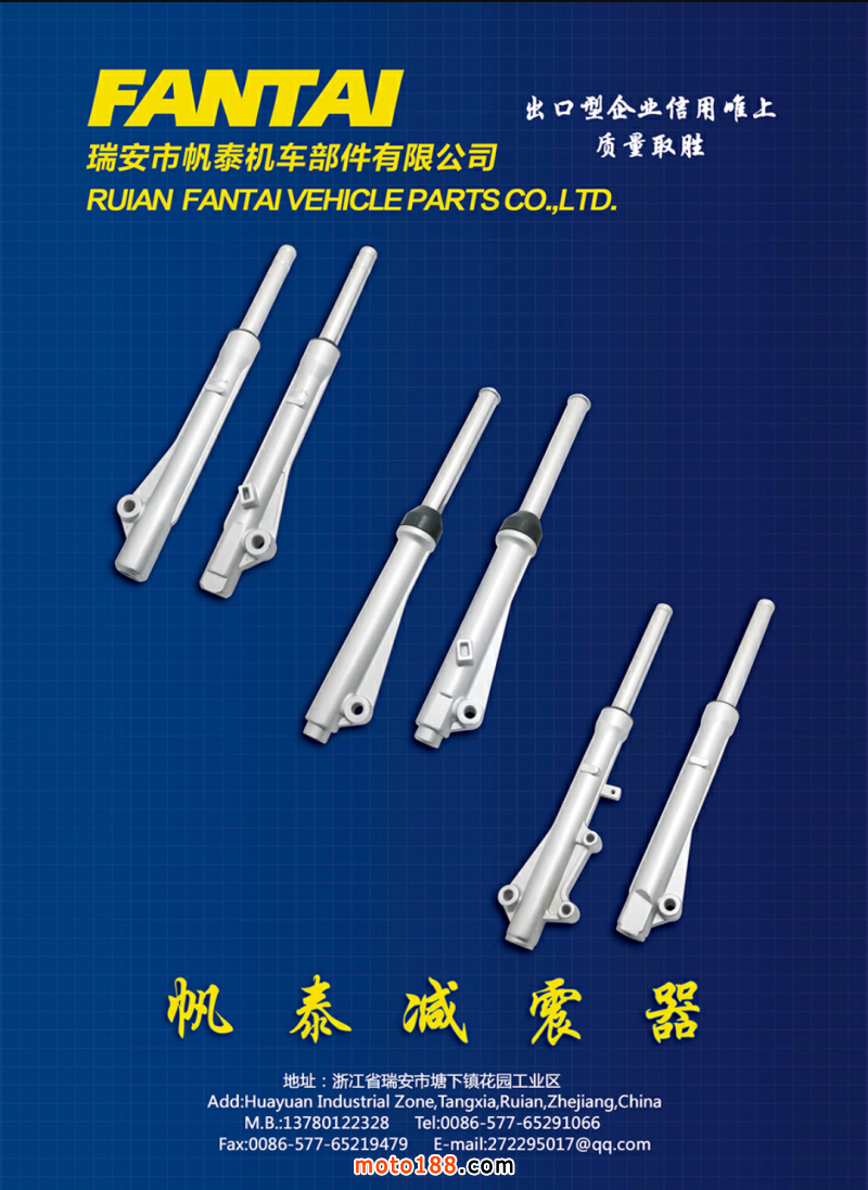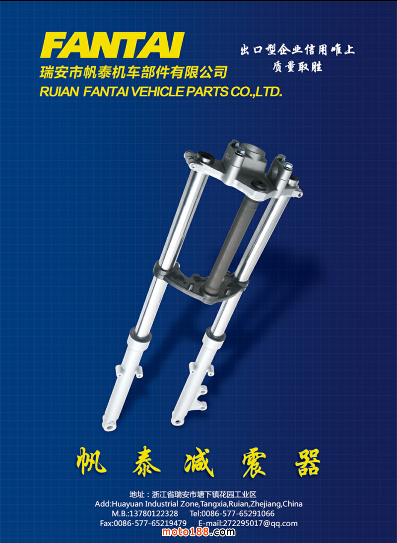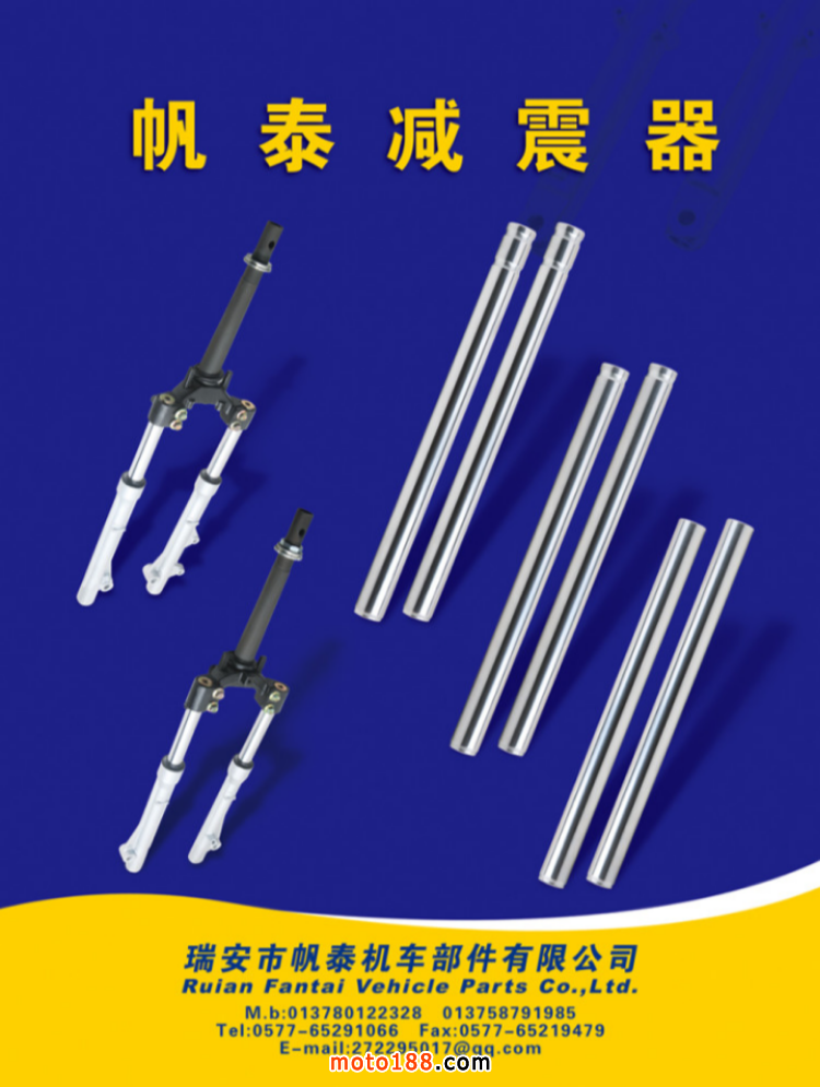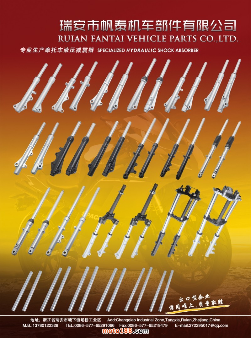 瑞安市帆泰機(jī)車部件有限公司,專業(yè)生產(chǎn)各種型號(hào)前減震器,產(chǎn)品出口東南亞、南美等地區(qū)。