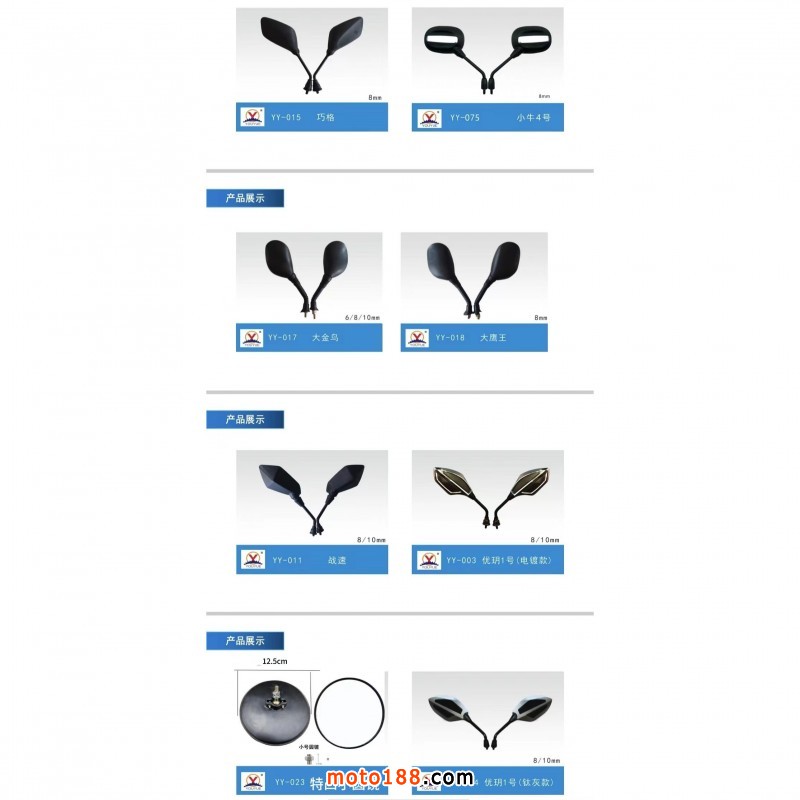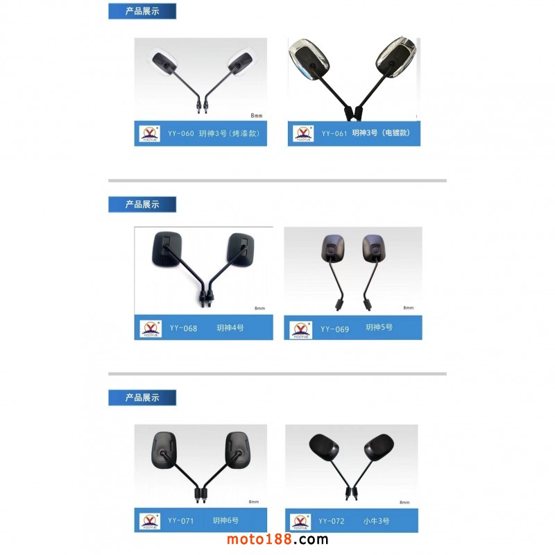 【溫州優玥機車部件有限公司】專業生產電動車、摩托車后視鏡。我們本著質量第一、誠信為本、合作雙贏的理念,真誠的與各位老板合作。聯系電話:15397338877(微信同號)。