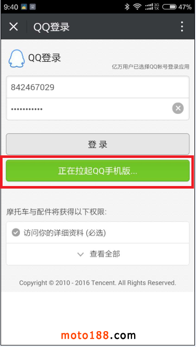 3.輸入QQ號及密碼,點擊一鍵登錄后,會自動拉起QQ手機版